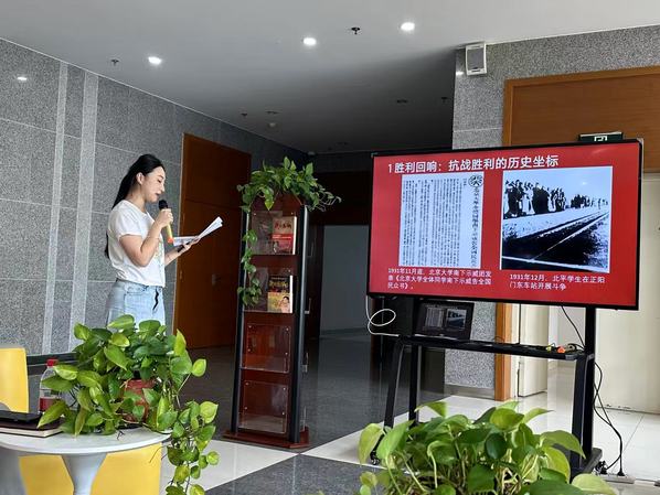 活动中,中国近现代史纲要教研室党支部书记宋书强结合历史语境与理论逻辑,深入剖析了中国共产党领导抗战的纲领性文献《论持久战》,清晰论证了我党在抗日战争中的中流砥柱地位,让在场党员深刻理解了革命理论对实践的指导意义。党员教师于静通过《奋起——抗战中的科学与科学家》一书,生动讲述了抗战时期大批科学家突破艰难险阻、坚守科研报国的动人故事,展现了民族危难之际知识分子的使命担当。思政教育专业研究生于永乐则以《抗战家书》为载体,通过诵读参加抗战的青年学生的书信片段,传递了战争年代里的青春热血与家国情怀。此外,图书与信息党委代表袁述、王荣、孙裕彤、章成敏和李静等五位党员,分享了他们对《抗战老兵》《我的抗战》《国破山河在:从日本史料揭秘中国抗战》《锦西卫》等红色读物的阅读感受。整场分享既有理论层面的深度解读,又有历史细节的生动描摹,也有青年视角的情感共鸣,共同构建起“科学救国—全民抗战—精神传承”的完整脉络。