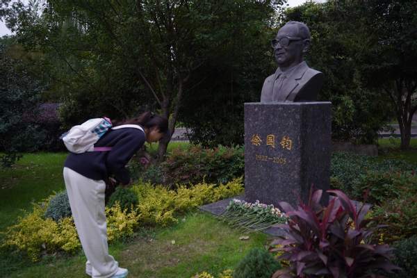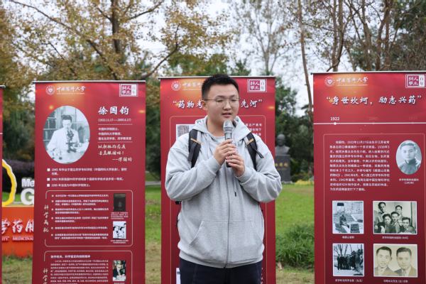 活动现场,徐国钧院士塑像前精心布置了8个主题鲜明的事迹宣传展板,分为“生药之光、照耀古今”、“药物考古、开创先河”、“身世坎坷、励志兴药”、“抗击病魔、鞠躬尽瘁”等内容,串联起徐国钧先生从求学至留校从事教学科研六十余年的人生脉络。同学们驻足凝视,不时用手机记录感人故事。