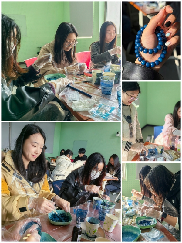 2025 年 12 月 8 日,马克思主义学院研究生党支部在教学楼A302-2举办靛蓝染珠特色活动,全体党员沉浸式参与实践,在传统手工艺劳动中感悟初心使命。